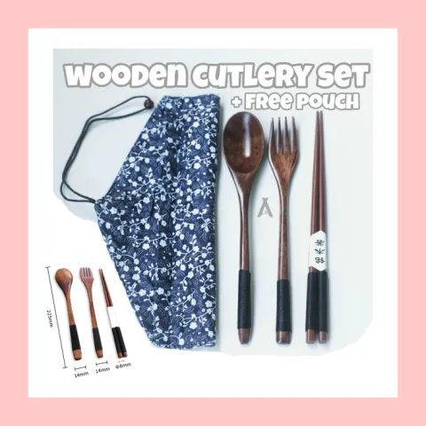 ALAT MAKAN SENDOK GARPU SUMPIT JEPANG SET WOODEN CUTLERY FREE POUCH