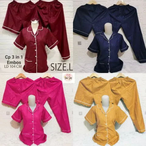 Baju Tidur Piyama Wanita Cewek Pajamas Dewasa Katun Motif Embos 3 in 1