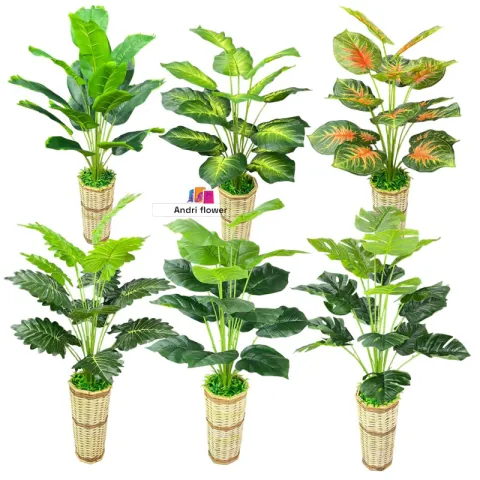 bunga hias daun jumbo 18 kuntum satu set dengan pot rotan,tingi 100 cm
