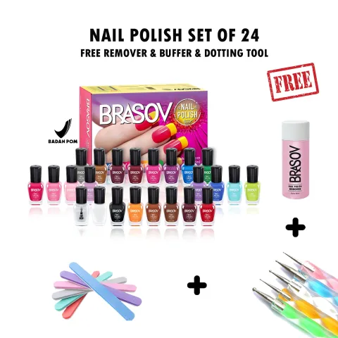 BRASOV Cat Kuku Set 24 PCS Nail Polish Assorted Colours Original Kutex Nude Kutek Poles Pewarna (FREE Remover, dotting Tool n Buffer)