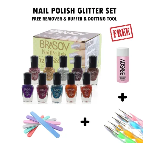 BRASOV Kutek Cat Kuku Glitter Combo 12 Pcs Kutek Nail Polish Glitter BPOM (FREE Dotting Tool n Buffer)
