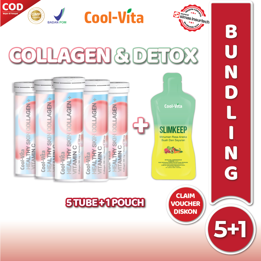 Cool-Vita Collagen 5 Botol Effervescent Kolagen Rasa Peach + 1 Pouch Slimkeep Fiber Detox Drink