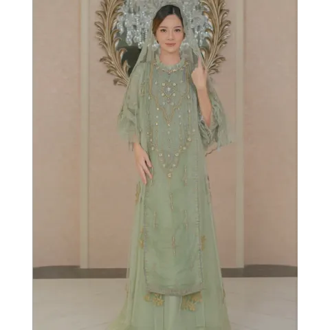 Raya 55 | Irish on Sage Flowery Inner Dress with Embroidery Cape