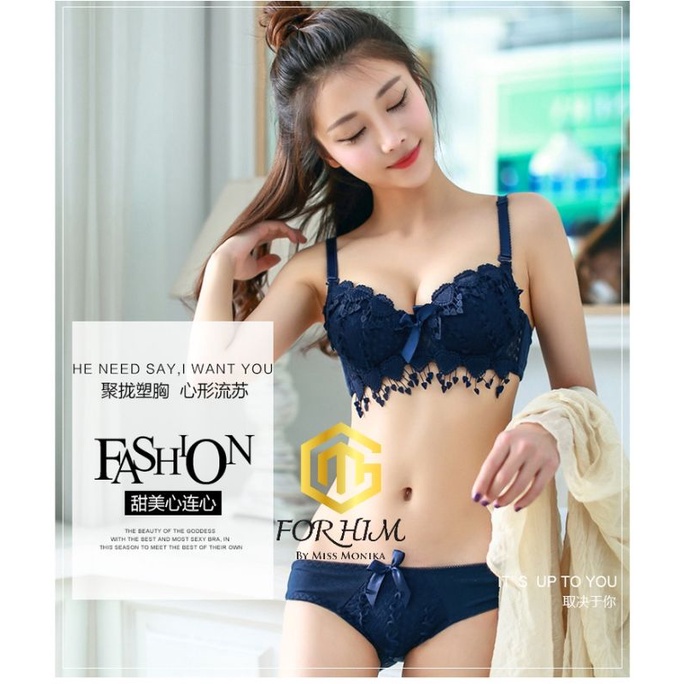 FOR HIM Set Bra Renda Celana Dalam Renda IMPORT 100% KAWAT PUSH UP SIZE 32 - Black, 32