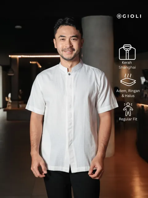 Baju Koko Pria Muslim Lengan Pendek Warna putih Tulang BW Motif Dobby Bahan Katun Premium Gioli Official