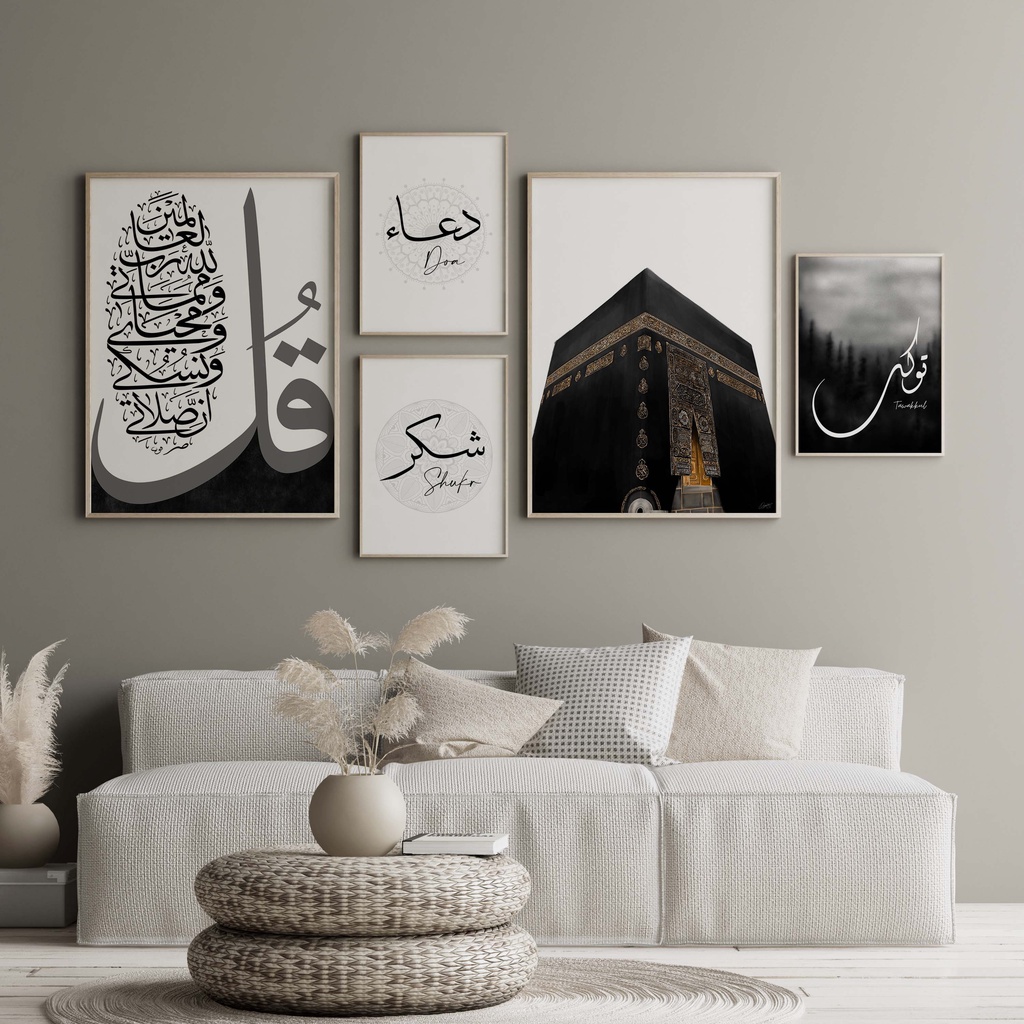 1 Set 5 pajangan dekorasi islami ruang tamu hitam putih Kaligrafi arab dan lukisan Kabah Mekah / Frame kayu dan art print poster A2 & A4 / minimalist aesthetic abstract