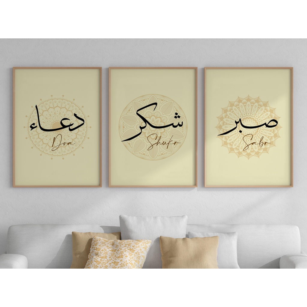 1 Set Pajangan dinding kaligrafi islam Sabar Syukur dan Doa / Pajangan Ruang Tamu / Art Print dan Frame Kayu Minimalist / kata kata motivasi islami