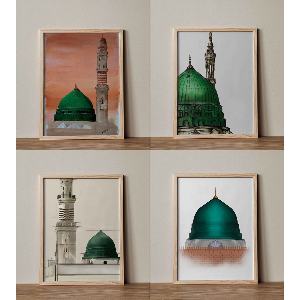 Pajangan dinding Islami Masjid An Nabawi (the green dome) - Madinah, Frame Kayu Minimalist, Islamic Home Decoration, Desain Interior islami