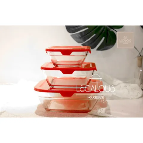 Maxim glassware persegi/ mangkok kaca + tutup 3 susun kotak