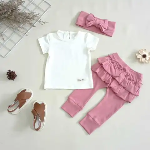 Kayleen Oneset Bandana - Setelan Baju Bayi Pendek Celana Panjang Ruffle Free Headband Bando SNI Maybee Kids Mybee
