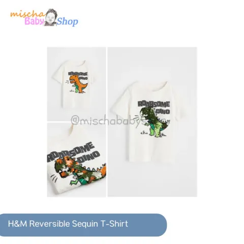H&M Reversible Sequin T-Shirt Natural white/Dinosaur Kaos Anak Laki-laki