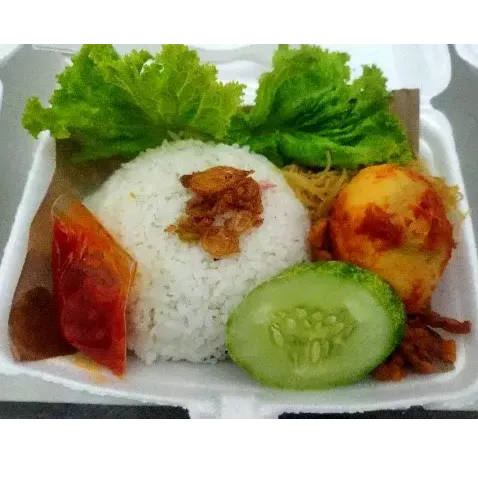 Paket hemat Rp 10.000,- Styrofoam box . Nasi Uduk / Putih + Telor balado + Bihun + lalapan