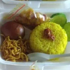 Paket hemat Rp 10.000,- Styrofoam box. Nasi kuning + Telor + Mi + Oreg + Lalapan.