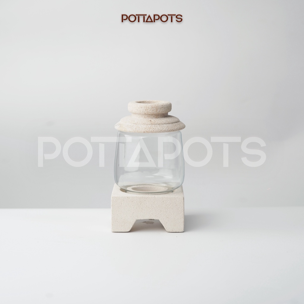 Tempat Lilin Candle Holder Lentera Lantern Batu Alam Natural Stone Kotak Square Putih White Kaca Glass Estetik Cantik